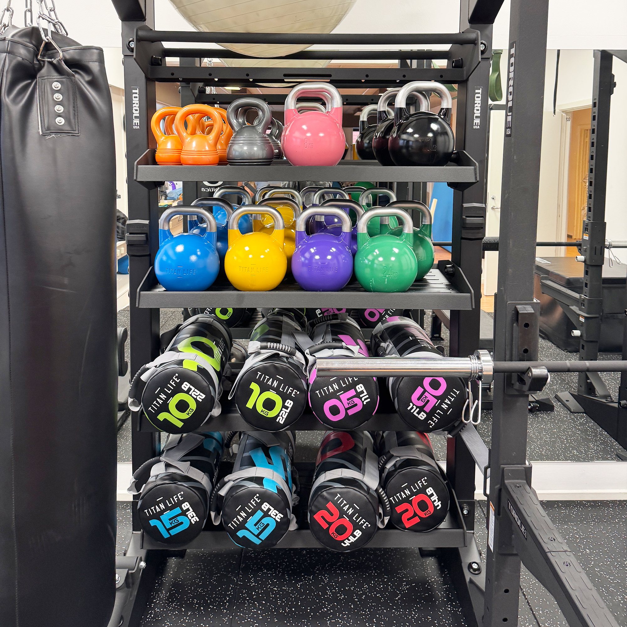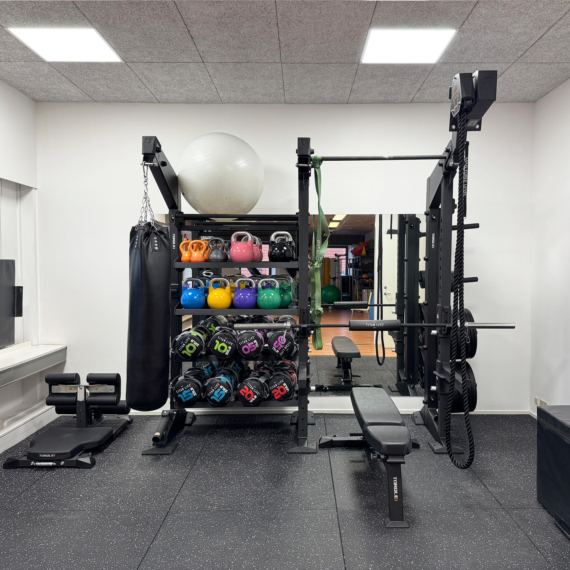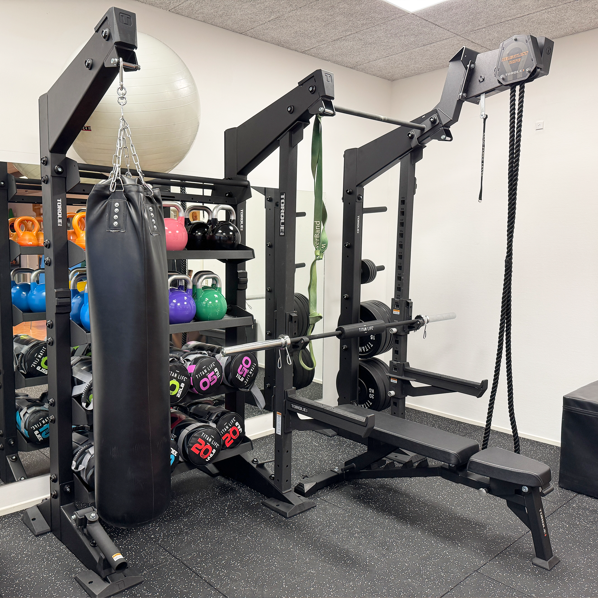 Torque‑løsningen udnytter hvert eneste kvadratmeter og giver mulighed for alsidig funktionel træning, samtidig med at opbevaring af udstyr er integreret direkte i systemet. Alt fra kettlebells og powerbags til større træningsredskaber har sin faste plads, altid lige ved hånden og uden visuel støj.