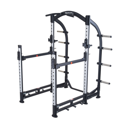 Sportsart Half Rack er lavet af materiale i den højeste kvalitet. Produktet har justerbare J-hooks og safety bar, og er designet med en åben ramme, der tillader overhead øvelser.